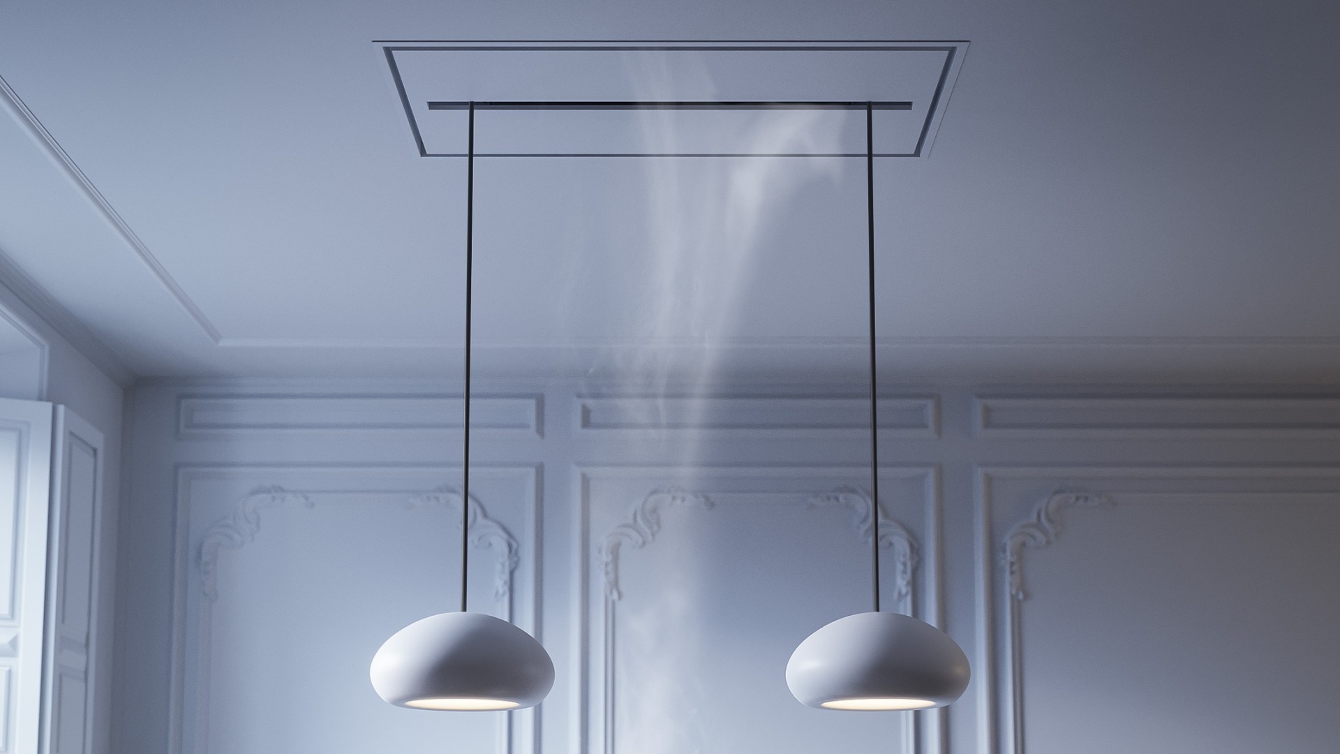 Supernova is a ceiling hood where the extraction unit, in painted stainless steel (matt white), is entirely integrated in the false-ceiling. The two domes in ceramic, hand-made and hand-painted by Deruta artisans, properly light up the hob. According to the design and the kitchen project, it is possible to add one or more ceramic Lamps
