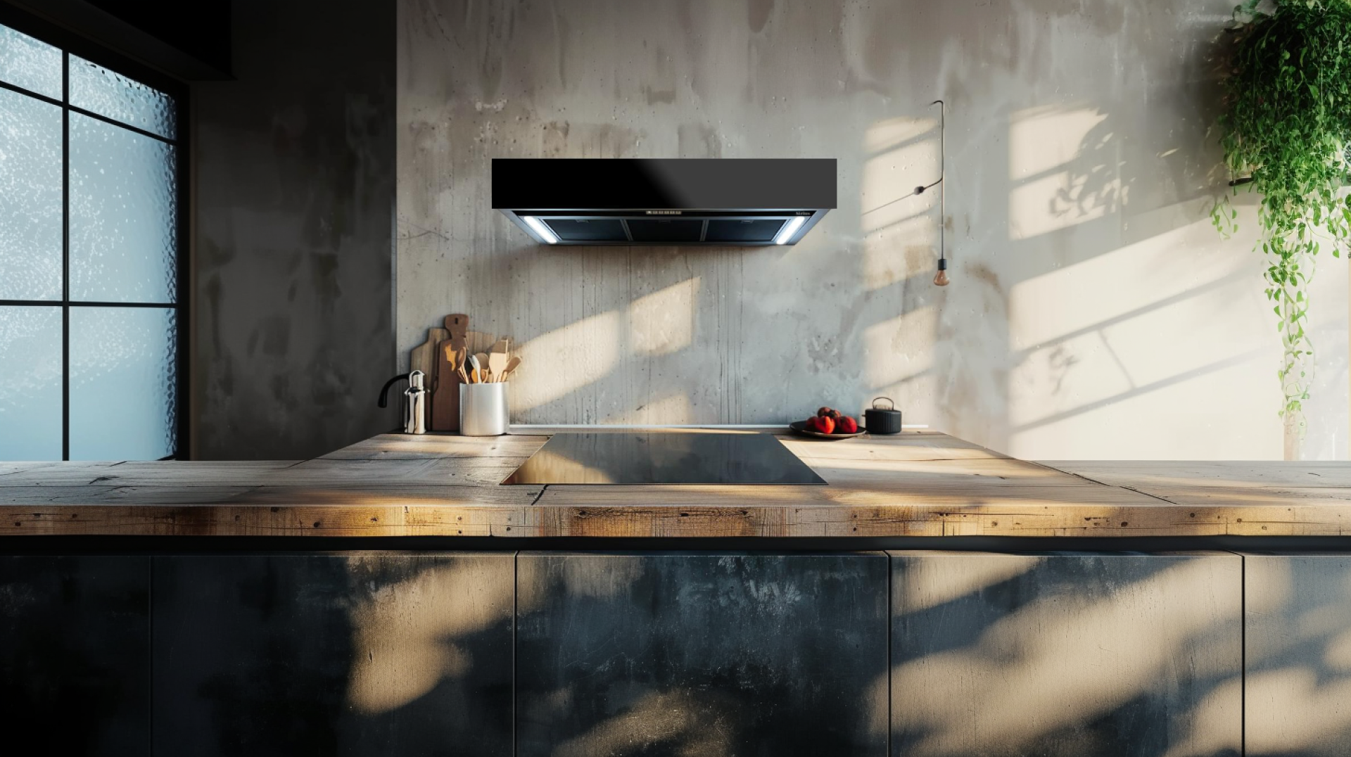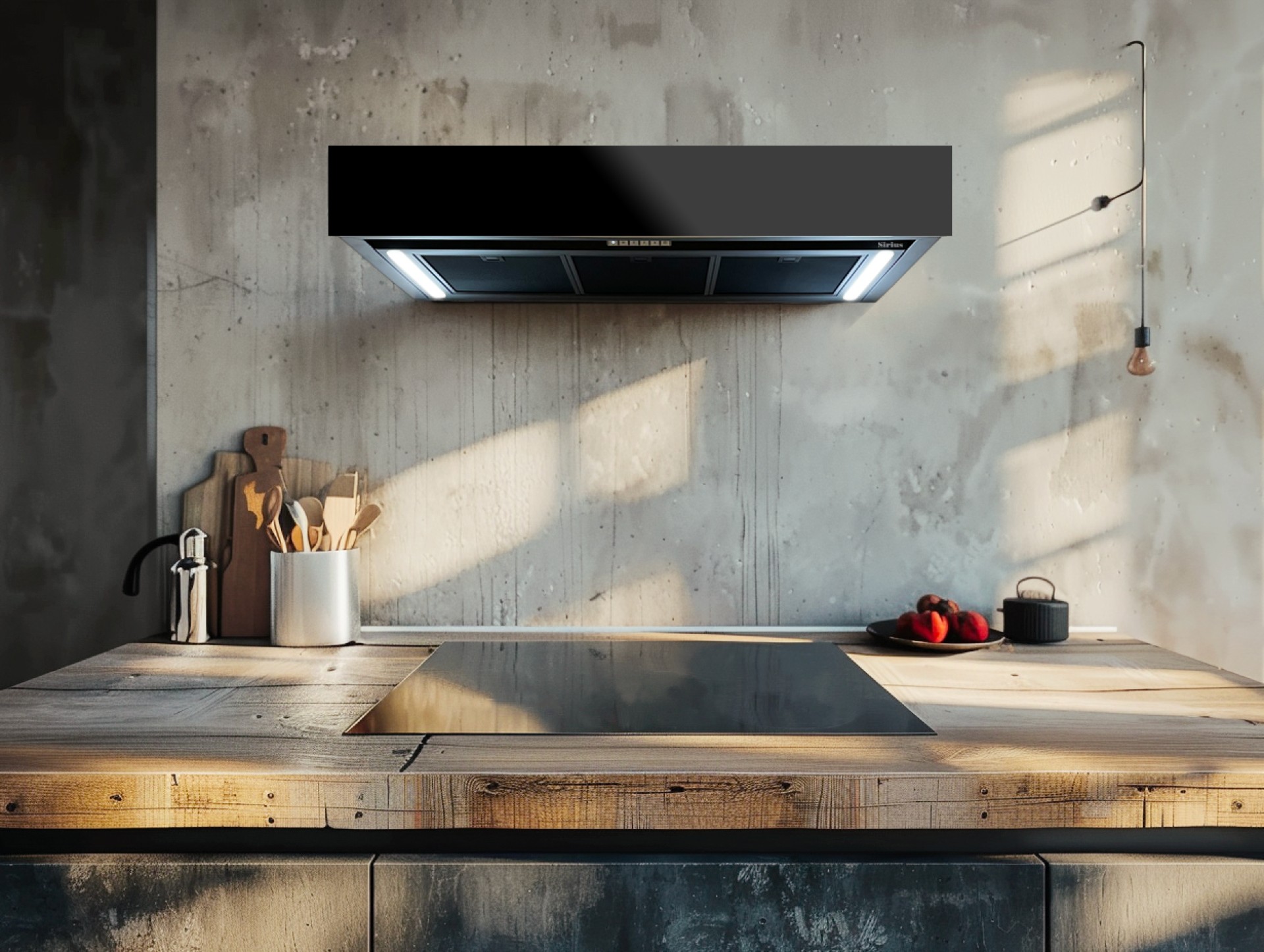 GEORGIE is a wall-mounted shelf-style filter hood with a matt black finish and matt black glass front panel