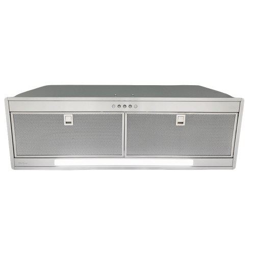 Stainless steel built-in unit with visible, removable and washable aluminium grease filters. Equipped with LED bar for optimal hob illumination and chrome push-button control panel.